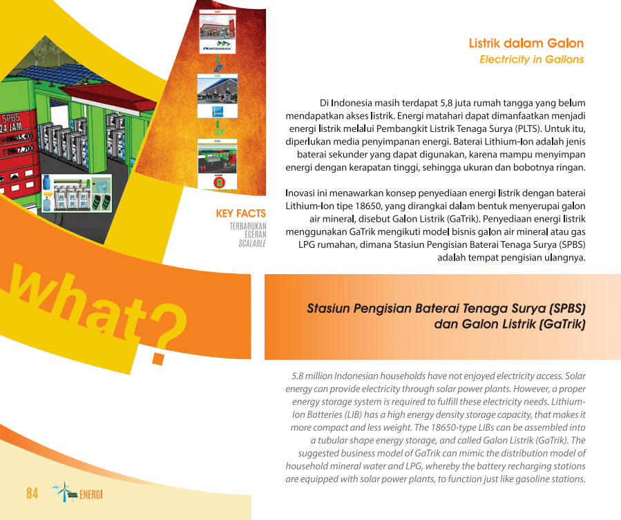 Di Indonesia masih terdapat 5,8 juta rumah tangga yang belum mendapatkan akses listrik. Energi matahari dapat dimanfaatkan menjadi energi listrik melalui Pembangkit Listrik Tenaga Surya (PLTS). Inovasi ini menawarkan konsep penyediaan energi listrik dengan baterai Lithium-Ion tipe 18650, yang dirangkai dalam bentuk menyerupai galon air mineral, disebut Galon Listrik (GaTrik).