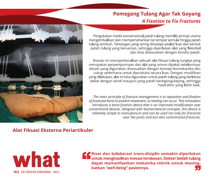 Pengobatan medis konvensional patah tulang memiliki prinsip utama mengembalikan dan mempertahankan ke tempat semula hingga patah tulang sembuh. Inovasi ini memperkenalkan sebuah alat fiksasi tulang tungkai yang merupakan penyempurnaan dari alat yang umum dipakai sebelumnya; desain yang digunakan disesuaikan dengan konsep biomekanika dan cukup sederhana untuk diproduksi secara luas.