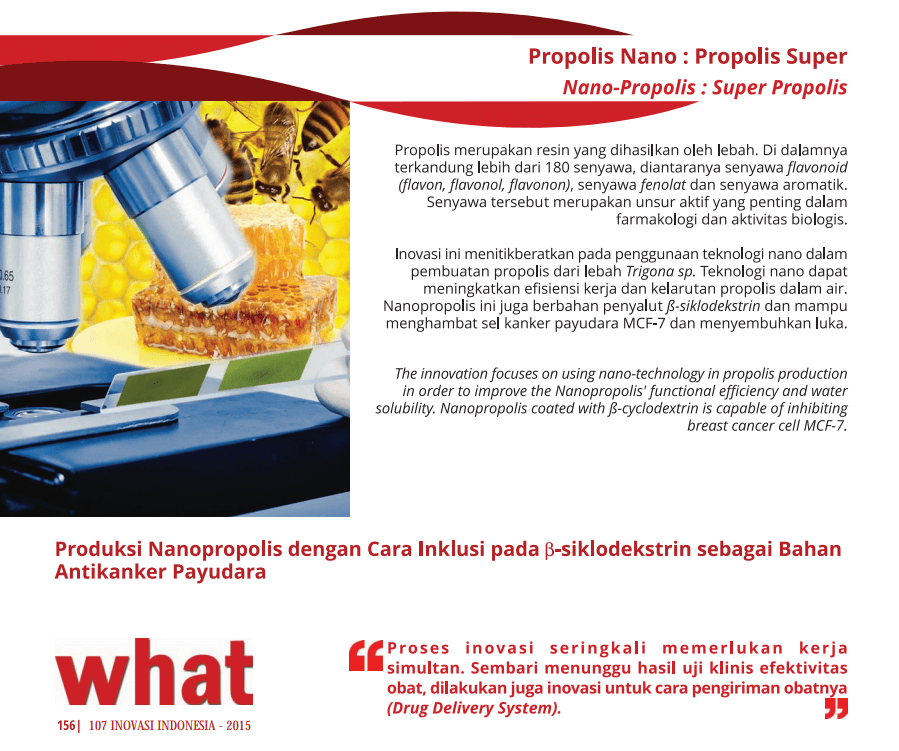 Propolis merupakan resin yang dihasilkan oleh lebah. Di dalamnya terkandung lebih dari 180 senyawa, diantaranya senyawa flavonoid (flavon, flavonol, flavonon), senyawa fenolat dan senyawa aromatik. Teknologi nano dapat meningkatkan efisiensi kerja dan kelarutan propolis dalam air.