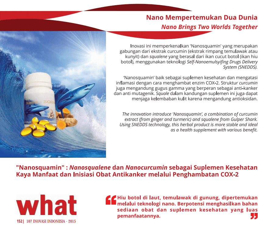 Inovasi ini memperkenalkan 'Nanosquamin' yang merupakan gabungan dari ekstrak curcumin (ekstrak rimpang temulawak atau kunyit) dan squalene yang berasal dari ikan cucut botol (ikan hiu botol), menggunakan teknologi Self-Nanoemulsyifing Drugs Delivery System (SNEDDS). Struktur curcumin juga mengandung gugus gamma yang berperan sebagai anti-kanker dan anti mutagenik.