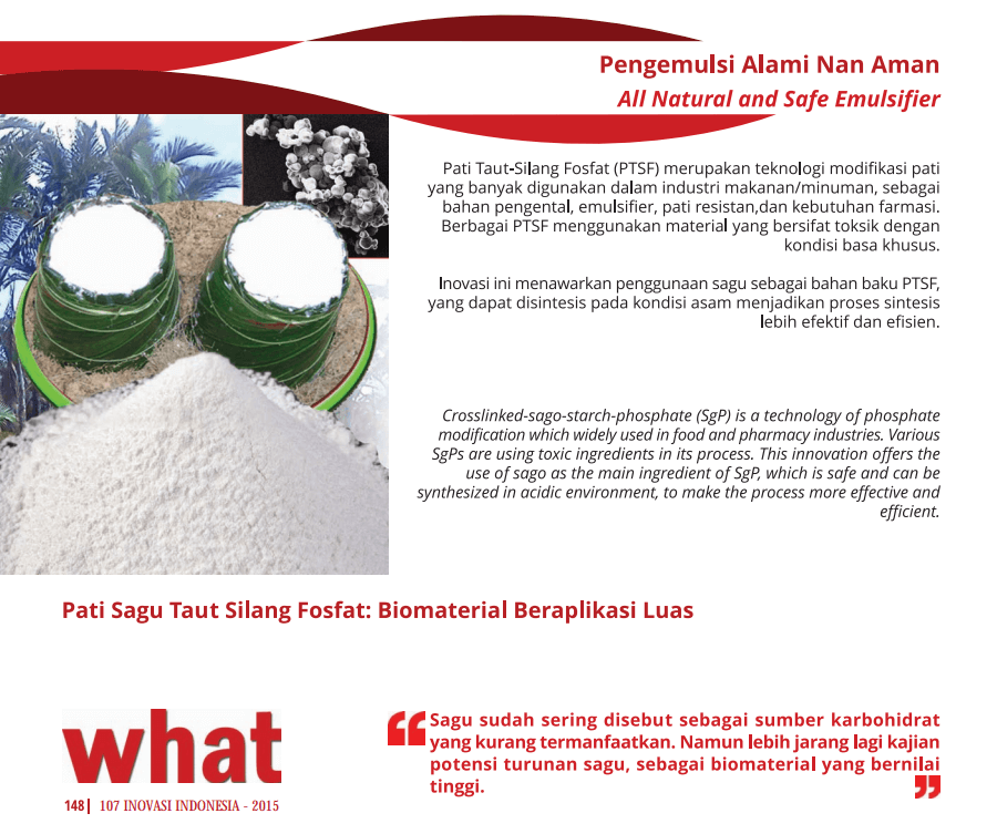 Pati Taut-Silang Fosfat (PTSF) merupakan teknologi modifikasi pati yang banyak digunakan dalam industri makanan/minuman, sebagai bahan pengental, emulsifier, pati resistan, dan kebutuhan farmasi. Inovasi ini menawarkan penggunaan sagu sebagai bahan baku PTSF, yang dapat disintesis pada kondisi asam menjadikan proses sintesis lebih efektif dan efisien.