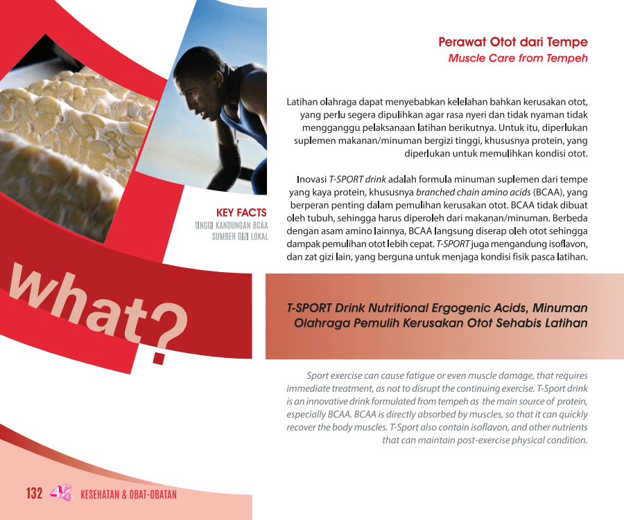 Latihan olahraga dapat menyebabkan kelelahan bahkan kerusakan otot, yang perlu segera dipulihkan agar rasa nyeri tidak mengganggu pelaksanaan latihan berikutnya. Inovasi T-SPORT drink adalah formula minuman suplemen dari tempe yang kaya protein yang berperan penting dalam pemulihan kerusakan otot.