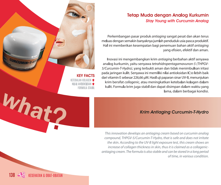 Perkembangan pasar produk antiaging sangat pesat dan akan terus meluas dengan semakin banyaknya jumlah penduduk usia pasca produktif. Inovasi ini mengembangkan krim antiaging berbahan aktif senyawa analog kurkumin, yaitu senyawa tetrahidropentagamavunon-5 (THPGV-5/Curcumin-T-Hydro), yang terbukti aman dan tidak menimbulkan iritasi pada jaringan kulit.