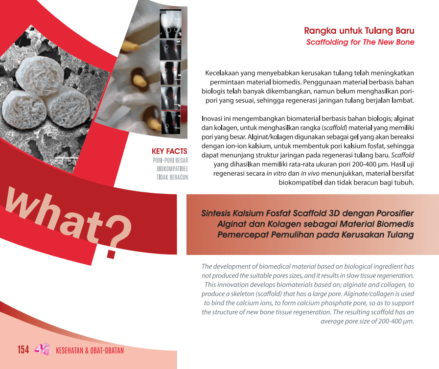 Kecelakaan yang menyebabkan kerusakan tulang telah meningkatkan permintaan material berbasis bahan biologis yang telah banyak dikembangkan, namun belum menghasilkan pori-pori yang sesuai, sehingga regenerasi jaringan tulang berjalan lambat. Inovasi ini mengembangkan biomaterial berbasis bahan biologis; alginat dan kolagen.