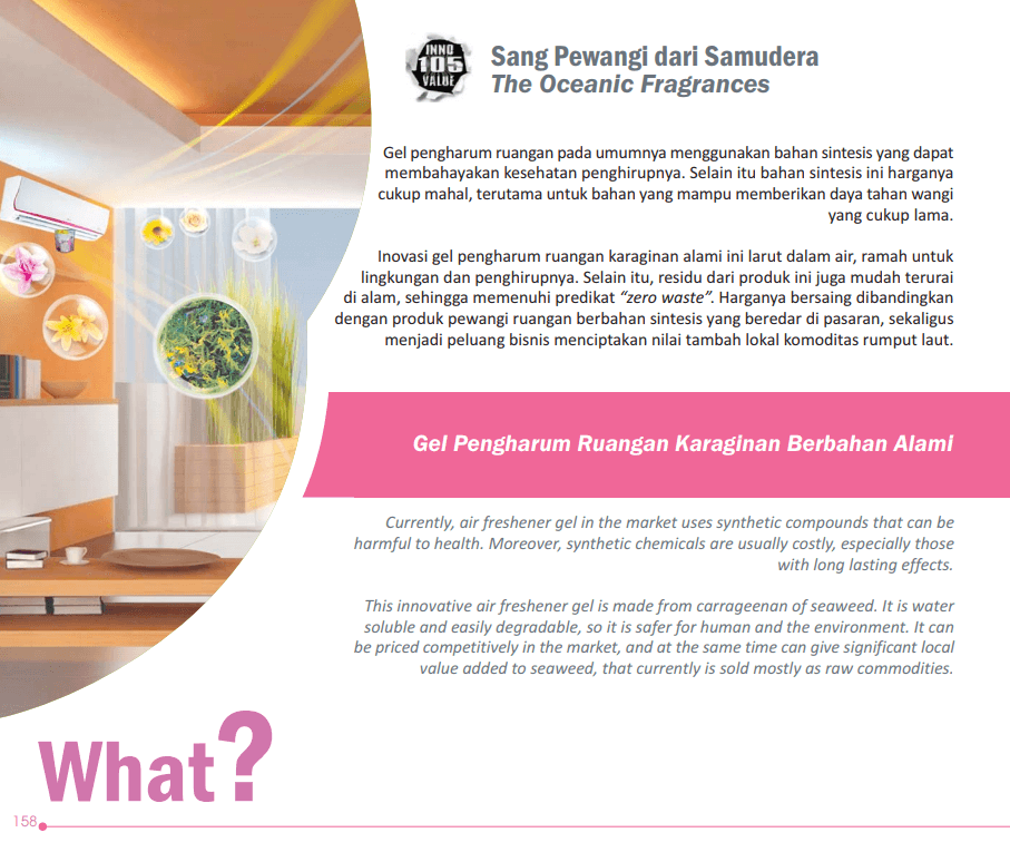 Gel pengharum ruangan pada umumnya menggunakan bahan sintesis yang dapat membahayakan kesehatan penghirupnya. Selain itu bahan sintesis ini harganya cukup mahal, terutama untuk bahan yang mampu memberikan daya tahan wangi yang cukup lama. Inovasi gel pengharum ruangan karaginan alami ini larut dalam air, ramah untuk lingkungan dan penghirupnya.