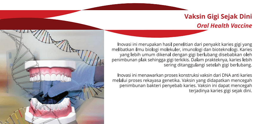 Inovasi ini merupakan hasil penelitian dari penyakit karies gigi yang melibatkan ilmu biologi molekuler, imunologi dan bioteknologi. Inovasi ini menawarkan konstruksi vaksin dari DNA anti karies ...