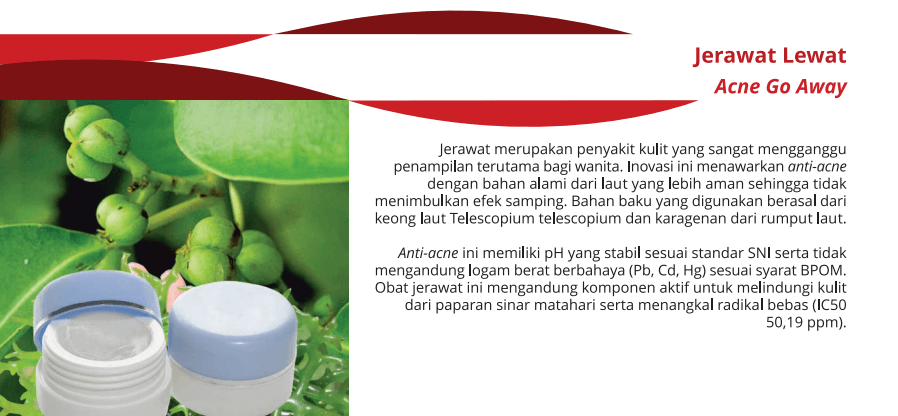 Jerawat merupakan penyakit kulit yang sangat mengganggu penampilan terutama bagi wanita. Inovasi ini menawarkan anti-acne dengan bahan alami dari laut yang lebih aman sehingga tidak menimbulkan ...