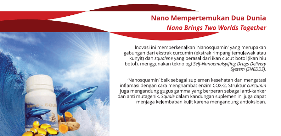 Inovasi ini memperkenalkan 'Nanosquamin' yang merupakan gabungan dari ekstrak curcumin (ekstrak rimpang temulawak atau kunyit) dan squalene yang berasal dari ikan cucut botol (ikan hiu botol), ...
