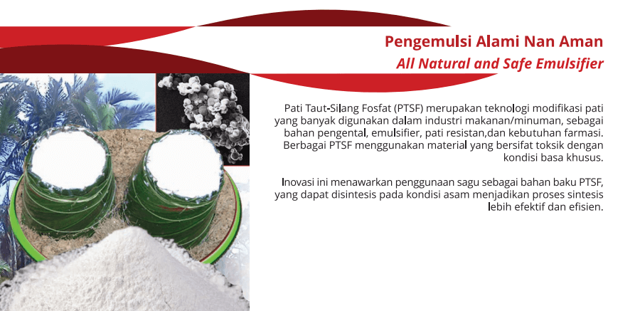 Pati Taut-Silang Fosfat (PTSF) merupakan teknologi modifikasi pati yang banyak digunakan dalam industri makanan/minuman, sebagai bahan pengental, emulsifier, pati resistan, dan kebutuhan farmasi. ...