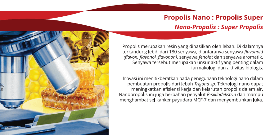 Propolis merupakan resin yang dihasilkan oleh lebah. Di dalamnya terkandung lebih dari 180 senyawa, diantaranya senyawa flavonoid (flavon, flavonol, flavonon), senyawa fenolat dan senyawa aromatik. ...