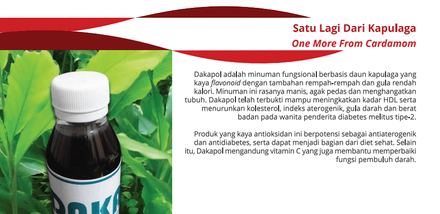 Dakapol adalah minuman fungsional berbasis daun kapulaga yang kaya flavonoid dengan tambahan rempah-rempah dan gula rendah kalori. Produk yang kaya antioksidan ini berpotensi sebagai antiaterogenik ...