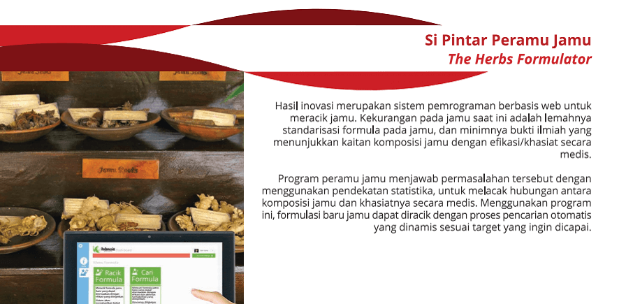 Hasil inovasi merupakan sistem pemrograman berbasis web untuk meracik jamu. Kekurangan pada jamu saat ini adalah lemahnya standarisasi formula pada jamu, dan minimnya bukti ilmiah yang menunjukkan ...