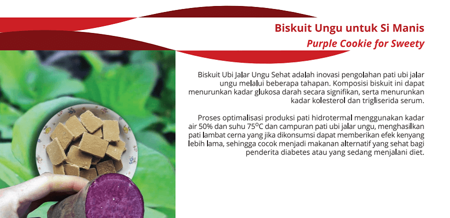 Biskuit Ubi Jalar Ungu Sehat adalah inovasi pengolahan pati ubi jalar ungu melalui beberapa tahapan. Komposisi biskuit ini dapat menurunkan kadar glukosa darah secara signifikan, serta menurunkan ...