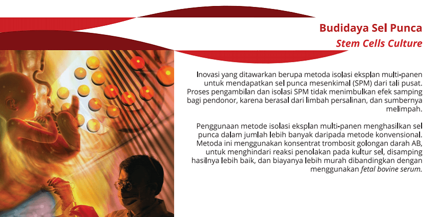 Inovasi yang ditawarkan berupa metoda isolasi eksplan multi-panen untuk mendapatkan sel punca mesenkimal (SPM) dari tali pusat. Penggunaan metode isolasi eksplan multi-panen menghasilkan selpunca ...