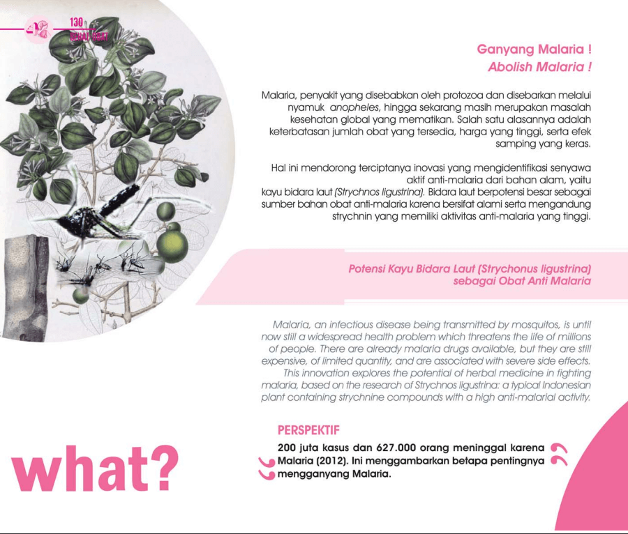 Malaria, penyakit yang disebabkan oleh protozoa dan disebarkan melalui nyamuk anopheles, hingga sekarang masih merupakan masalah kesehatan global yang mematikan. Inovasi ini mengidentifikasi potensi pengembangan senyawa aktif anti-malaria dari bahan alam, yaitu kayu bidara laut (Strychnos ligustrina).