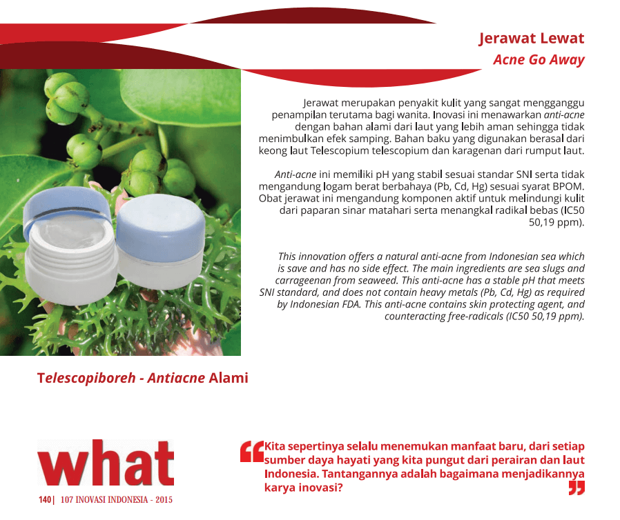 Jerawat merupakan penyakit kulit yang sangat mengganggu penampilan terutama bagi wanita. Inovasi ini menawarkan anti-acne dengan bahan alami dari laut yang lebih aman sehingga tidak menimbulkan efek samping. Bahan baku yang digunakan berasal dari keong laut Telescopium telescopium dan karagenan dari rumput laut.