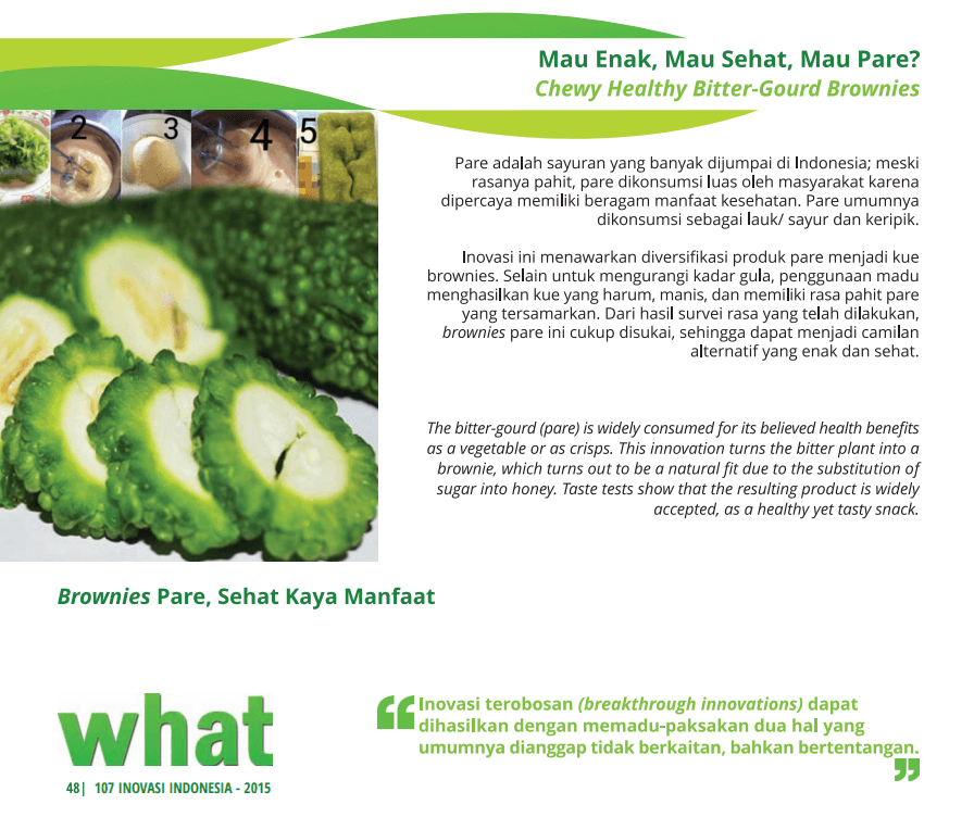 Pare adalah sayuran yang banyak dijumpai di Indonesia; meski rasanya pahit, pare dikonsumsi luas oleh masyarakat karena dipercaya memiliki beragam manfaat kesehatan. Inovasi ini menawarkan diversifikasi produk pare menjadi kue brownies.