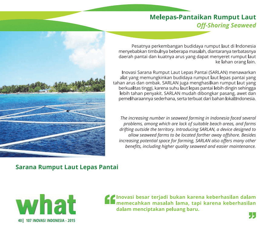 Pesatnya perkembangan budidaya rumput laut di Indonesia menyebabkan timbulnya beberapa masalah, diantaranya terbatasnya daerah pantai dan kuatnya arus yang dapat menyeret rumput lautke lahan orang lain. Inovasi Sarana Rumput Laut Lepas Pantai (SARLAN) menawarkan alat yang memungkinkan budidaya rumput laut lepas pantai yang tahan arus dan ombak.
