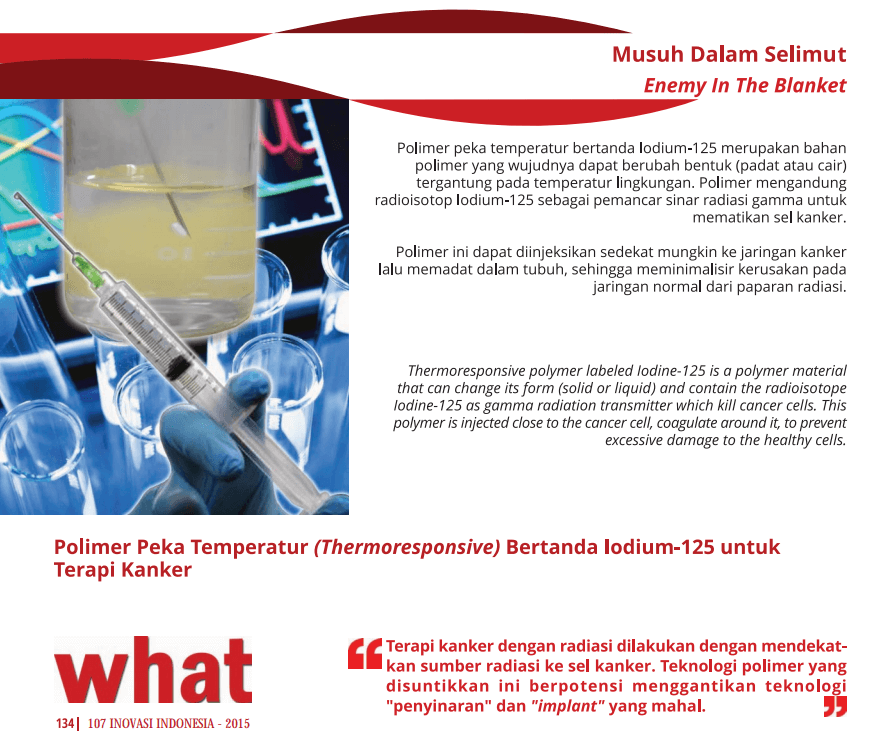 Polimer peka temperatur bertanda Iodium-125 merupakan bahan polimer yang wujudnya dapat berubah bentuk (padat atau cair) tergantung pada temperatur lingkungan. Polimer yang mengandung radioisotop Iodium-125 sebagai pemancar sinar radiasi gamma untuk mematikan sel kanker ini diinjeksikan sedekat mungkin ke jaringan kanker agar menggumpal di sekitarnya, untuk meminimalisir kerusakan pada jaringan normal dari paparan radiasi.