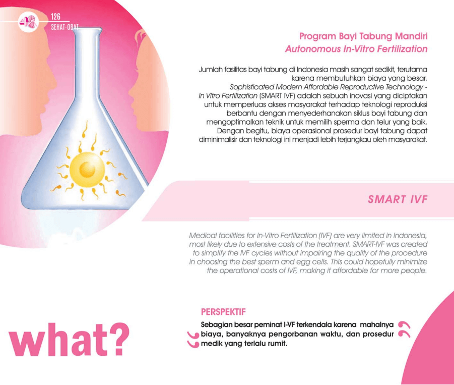 Jumlah fasilitas bayi tabung di Indonesia masih sangat sedikit, terutama karena membutuhkan biaya yang besar. Sophisticated Modern Affordable Reproductive Technology - In Vitro Fertilization (SMART IVF) adalah sebuah inovasi yang menyederhanakan siklus bayi tabung dan mengoptimalkan teknik untuk memilih sperma dan telur yang baik sehingga lebih terjangkau oleh masyarakat.