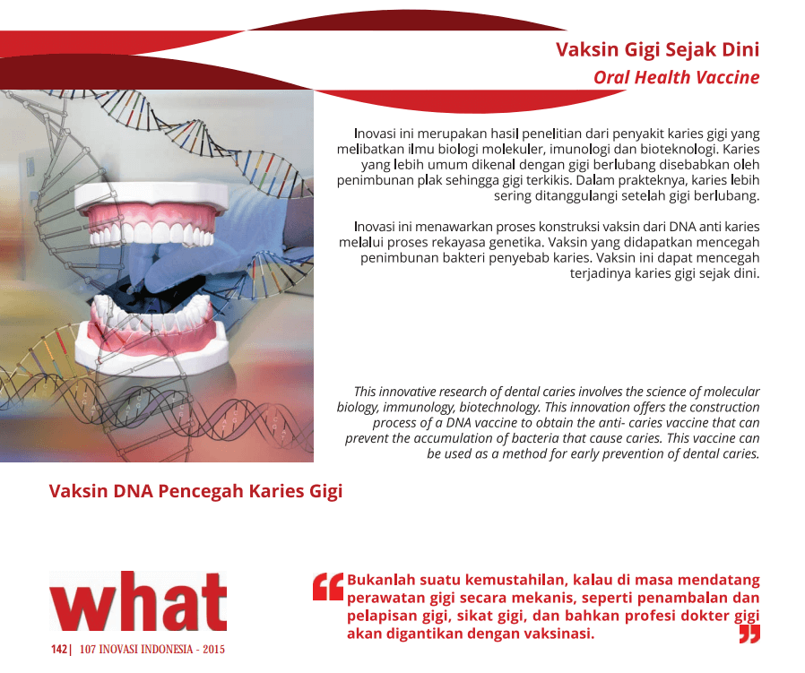 Inovasi ini merupakan hasil penelitian dari penyakit karies gigi yang melibatkan ilmu biologi molekuler, imunologi dan bioteknologi. Inovasi ini menawarkan konstruksi vaksin dari DNA anti karies melalui proses rekayasa genetika. Vaksin yang didapatkan mencegah penimbunan bakteri penyebab karies.