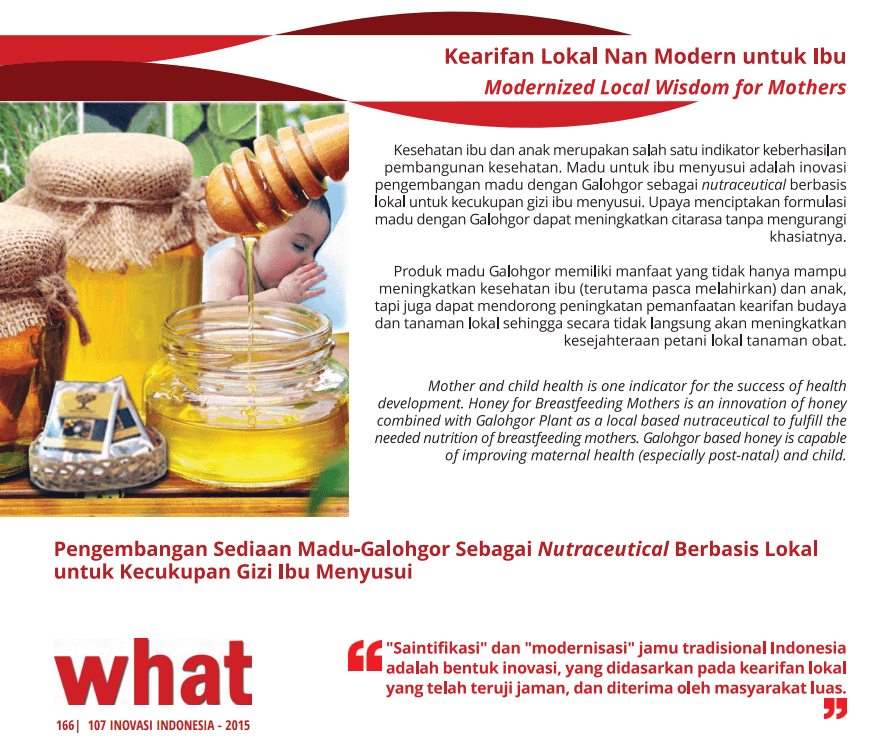 Kesehatan ibu dan anak merupakan salah satu indikator keberhasilan pembangunan kesehatan. Produk madu Galohgor memiliki manfaat yang tidak hanya mampu meningkatkan kesehatan ibu (terutama pasca melahirkan) dan anak, tapi juga dapat mendorong peningkatan pemanfaatan kearifan budaya dan tanaman lokal.
