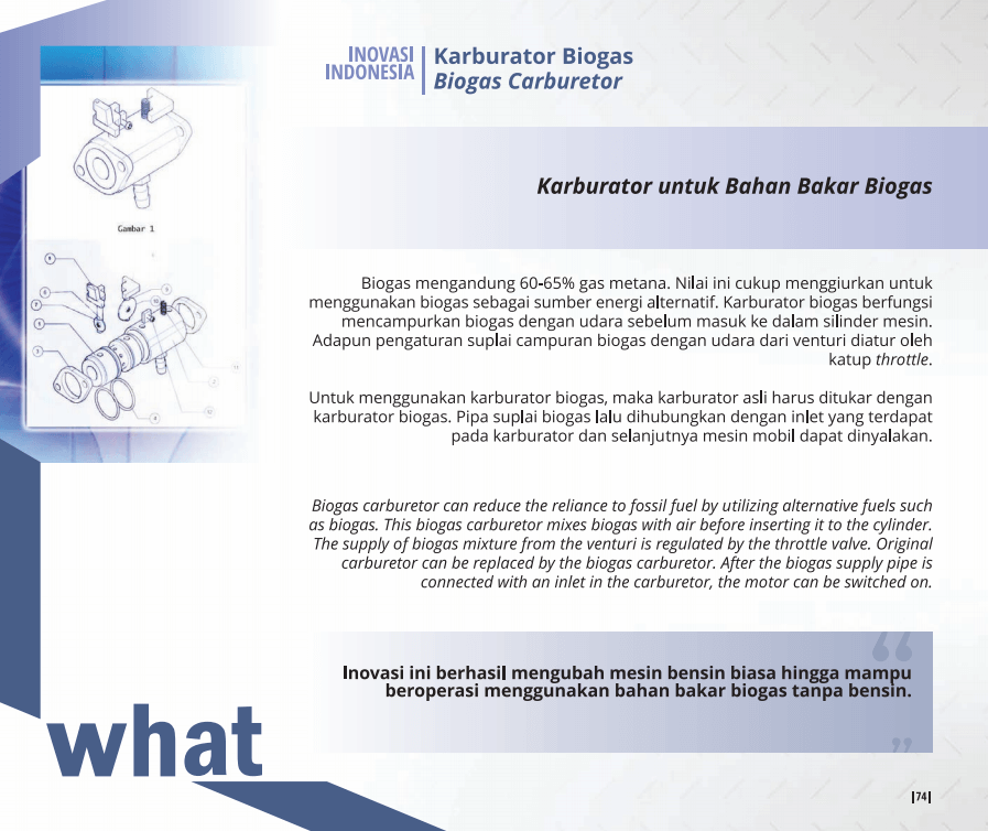 Biogas mengandung 60-65% gas metana. Nilai ini cukup menggiurkan untuk menggunakan biogas sebagai sumber energi alternatif. Karburator biogas berfungsi mencampurkan biogas dengan udara sebelum masuk ke dalam silinder mesin. Adapun pengaturan suplai campuran biogas dengan udara dari venturi diatur oleh katup throttle.