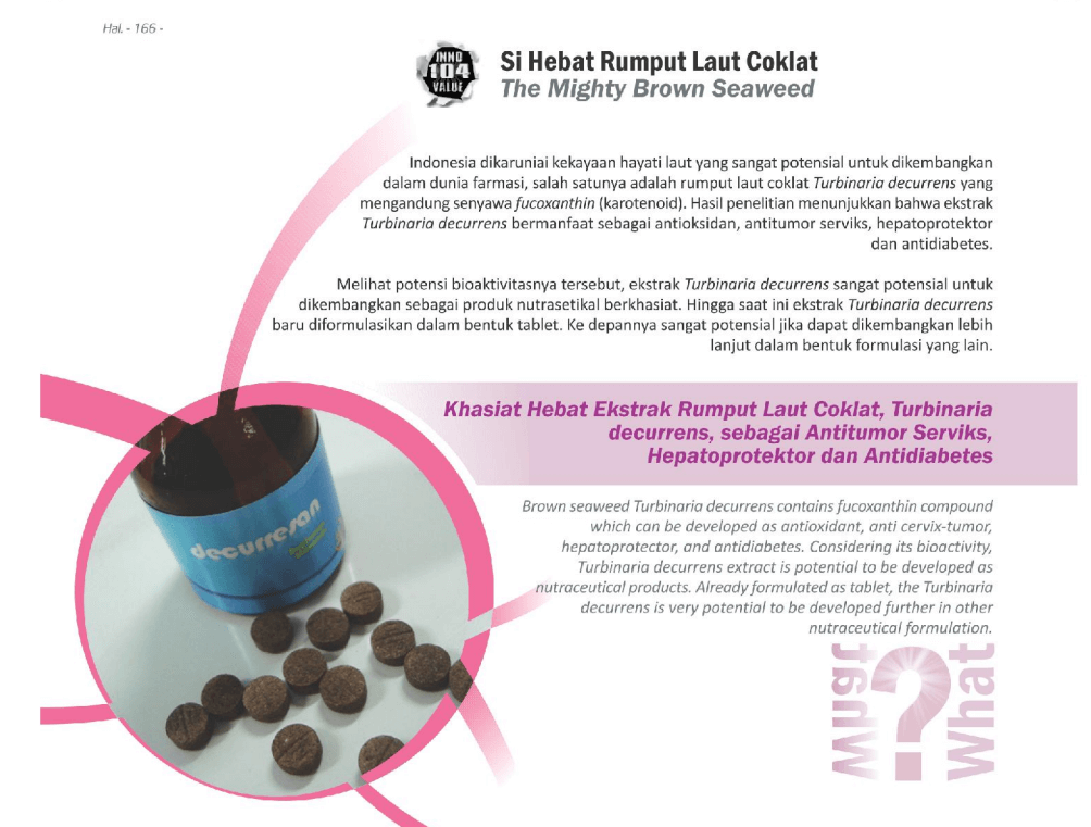 Indonesia dikaruniai kekayaan hayati laut yang sangat potensial untuk dikembangkan dalam dunia farmasi, salah satunya adalah rumput laut coklat Turbinaria decurrensyangmengandung senyawa fucoxanthin(karotenoid). Hasil penelitian menunjukkan bahwa ekstrak Turbinaria decurrensbermanfaat sebagai antioksidan, antitumor serviks, hepatoprotektor, dan antidiabetes.