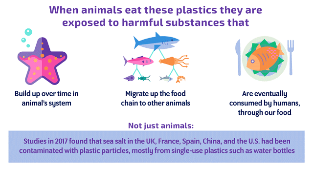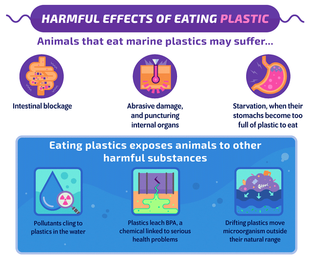 Memakan plastik juga akan membuat binatang laut terpapar dengan bahan beracun yang berbahaya, seperti: polutan yang menempel di air laut, dan BPA yang terkandung pada plastik (yang dapat menimbulkan berbagai gangguan kesehatan serius).