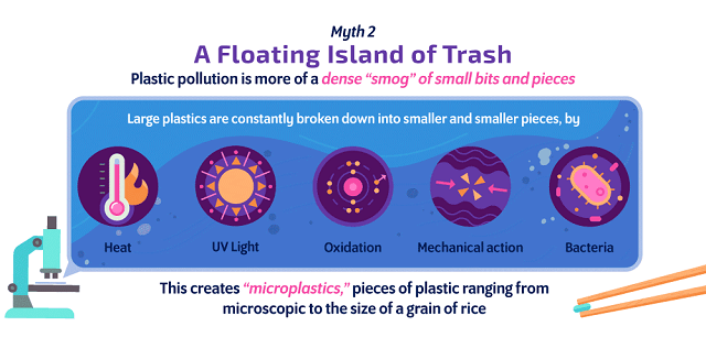 Proses ini mengubah limbah plastik menjadi mikroplastik, yakni kepingan plastik mulai dari yang berukuran miskroskopis hingga sebesar butiran beras (plastik yang dikategorikan sebagai mikroplastik adalah yang ukurannya maksimal 0,5 mm). Ketika organisme laut yang berukuran kecil memakan mikroplastik, melalui rantai makanan, racun yang mereka telan akan ditelan pula oleh binatang pemangsa mereka, dan bisa jadi akan sampai pula ke piring manusia yang mengkonsumsi ikan atau seafood.