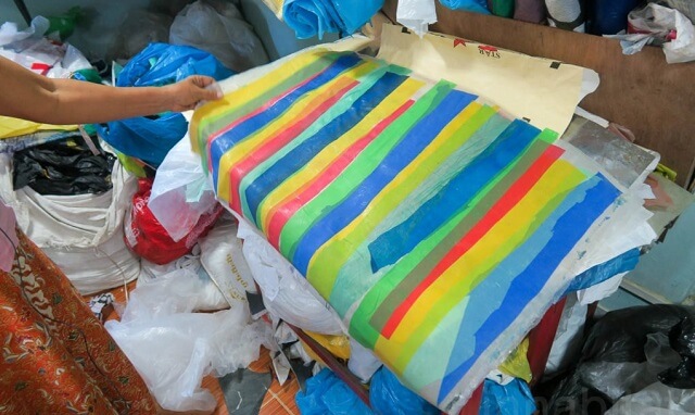 (Plastik berwarna-warni yang disambung-sambung untuk dijadikan bahan kerajinan)