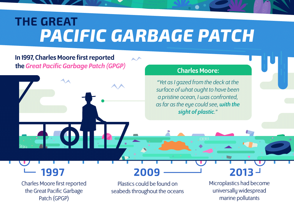 Di seluruh dunia, penggunaan plastik mencapai 320 juta ton per hari, dan 2,41 juta ton di antaranya berakhir di lautan. Pada tahun 1997, Charles Moore pertama kali melaporkan adanya The Great Pacific Garbage Patch (GPGP). Tahun 2009, plastik dapat ditemukan di seluruh dasar samudera. Tahun 2013, mikroplastik telah menjadi polutan laut yang tersebar di seluruh dunia.