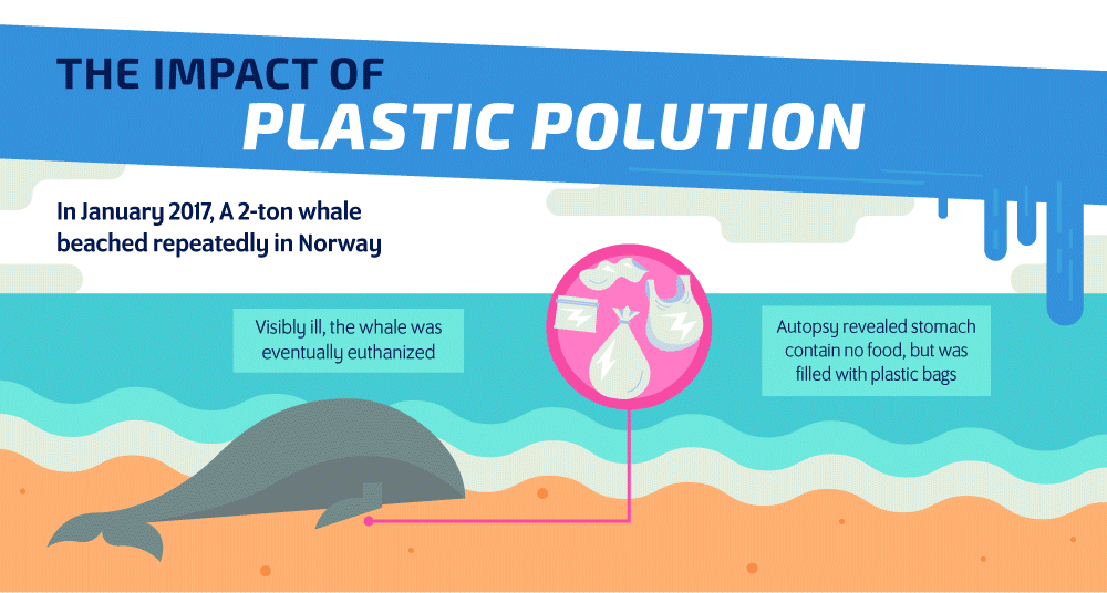 Salah satu dampak limbah plastik: pada bulan Januari 2017 lalu, seekor paus seberat 2 ton berkali-kali terdampar di pantai Norwegia. Paus yang sakit parah itu kemudian di-euthanasia. Hasil autopsi menunjukkan bahwa di dalam perutnya tidak ada makanan, tetapi penuh dengan tas plastik.