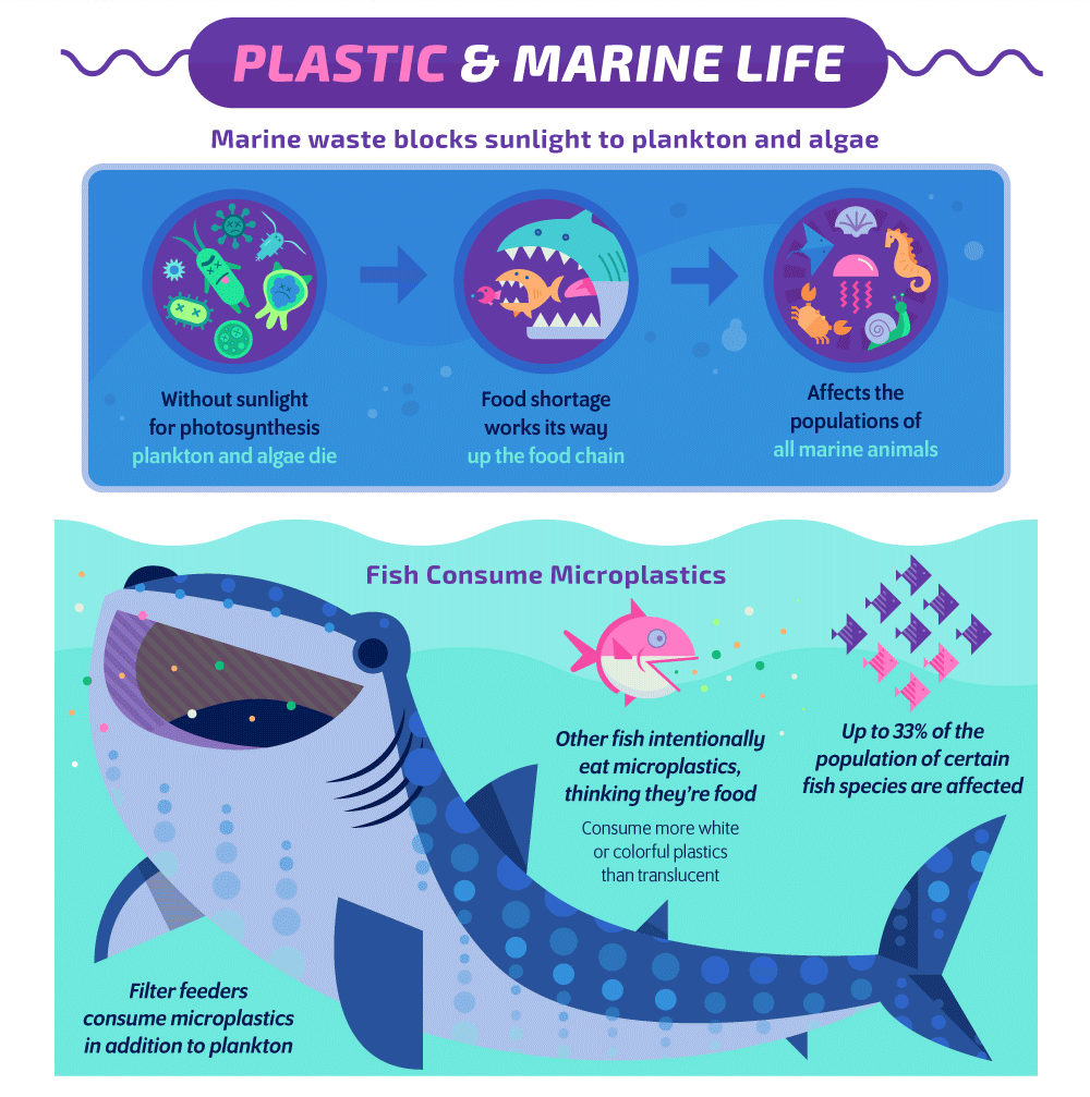 Limbah plastik dan sampah lainnya di laut menghalangi plankton dan alga mendapatkan sinar matahari. Tanpa itu, plankton dan alga akan mati karena tidak dapat melakukan fotosintesa. Hal ini akan mempengaruhi rantai makanan di laut, sehingga binatang di laut pun banyak yang mati karena kekurangan makanan.