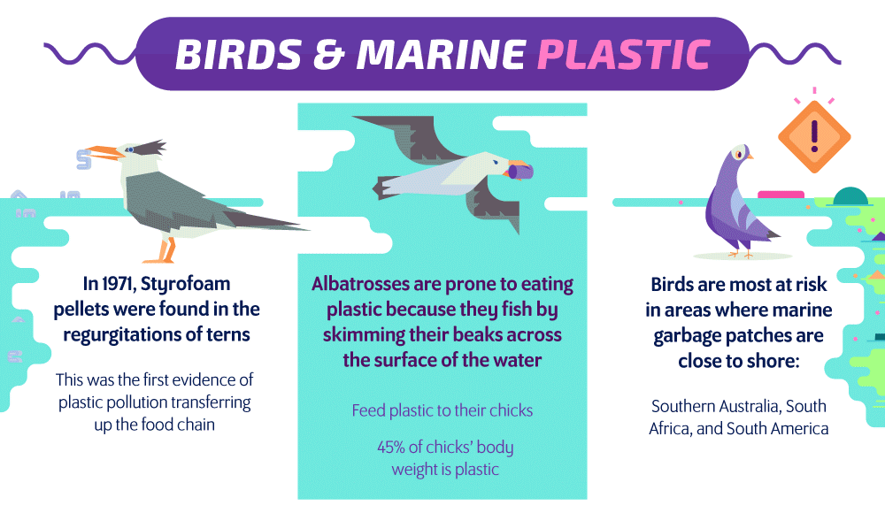 Pada tahun 1971, ditemukan burung laut yang memuntahkan kepingan styrofoam, ini adalah bukti pertama bahwa limbah plastik telah memasuki rantai makanan. Burung Albatross memiliki kecenderungan tinggi untuk memakan plastik, karena mereka mencari makan (ikan) dengan cara menyisirkan paruh mereka sepanjang permukaan air. Induk Albatross yang menyuapi anak-anaknya dengan plastik akan membuat tubuh anaknya mengandung 45% plastik.
