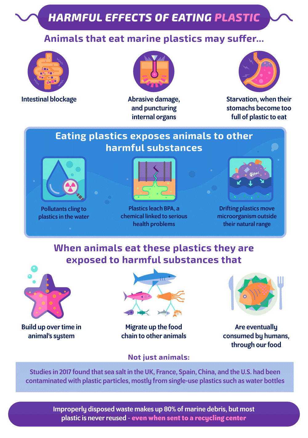 Ketika binatang laut memakan plastik, racun tersebut terakumulasi dalam tubuh mereka dari waktu ke waktu, membuat mereka sakit hingga meninggal. Melalui rantai makanan, racun yang mereka telan akan ditelan pula oleh binatang pemangsa mereka, dan bisa jadi akan sampai pula ke piring manusia yang mengkonsumsi ikan atau seafood.