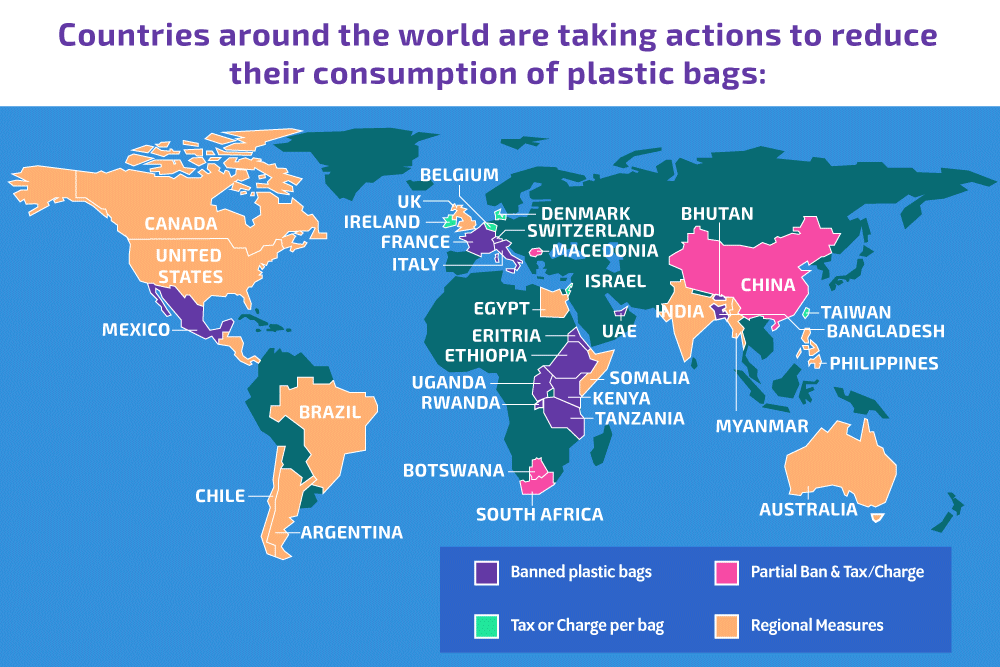 Beberapa negara telah memberlakukan larangan pemakaian tas plastik sekali pakai. Ironisnya, banyak di antaranya justru negara-negara Afrika seperti Eritria, Ethiopia, Uganda, Rwanda, Kenya, dan Tanzania. Di Amerika Tengah ada Mexico, dan di Asia baru Bangladesh dan Bhutan yang memberlakukannya. Di negara-negara besar dan maju, baru ada 3 negara Eropa yang mengaplikasikannya di seluruh negara, yaitu Perancis, Italia, dan Swiss. Sedangkan di beberapa negara maju lainnya seperti Inggris, China, Kanada, dan AS, larangan tersebut masih sebatas diberlakukan di beberapa wilayah dan belum bersifat nasional.