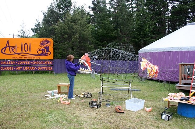 Ketika sampah dari laut menepi ke pantai, 'Washed Ashore' memakainya untuk dibentuk menjadi patung. Washed Ashore adalah proyek seni komunitas non-profit yang didirikan oleh seniman dan pendidik, Angela Haseltine Pozzi pada tahun 2010. Proyek ini berada di Bandon, Oregon, di mana Pozzi pertama kali melihat sedemikian banyak sampah terdampar di pantai yang ia cintai. Pozzi kemudian memutuskan untuk mengambil tindakan, yakni dengan memungut sampah dari pantai Samudera Pasifik tersebut dan mengubahnya menjadi karya seni monumental untuk menggugah kepedulian terhadap krisis sampah laut global.