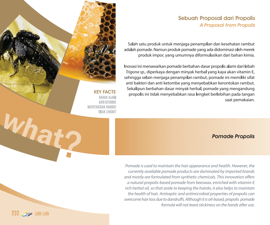 Salah satu produk untuk menjaga penampilan dan kesehatan rambut adalah pomade yang didominasi oleh merek produk impor dan umumnya diformulasikan dari bahan kimia. Inovasi ini menawarkan pomade berbahan dasar propolis alami dan diperkaya dengan minyak herbal yang kaya akan vitamin E.
