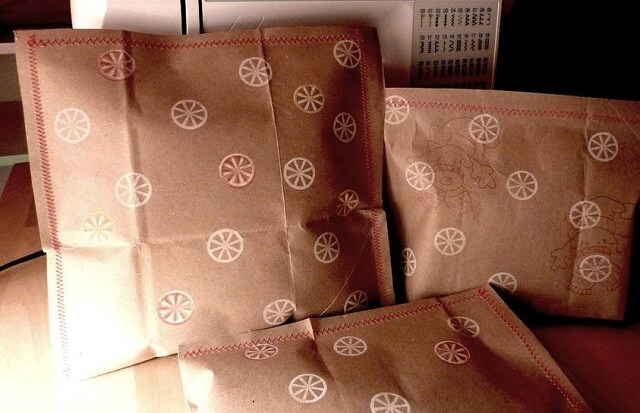 7. Kertas bekas berwarna coklat selalu memunculkan kesan natural. Coba padukan dengan teknik sablon untuk membuat motif, dan gunakan mesin jahit zig-zag untuk mengunci bungkusan. Hemat lem, pita perekat, sekaligus menjadi elemen dekoratif yang cantik.