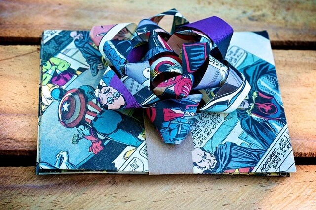 1. Manfaatkan komik bekas untuk membungkus kado lengkap dengan pitanya