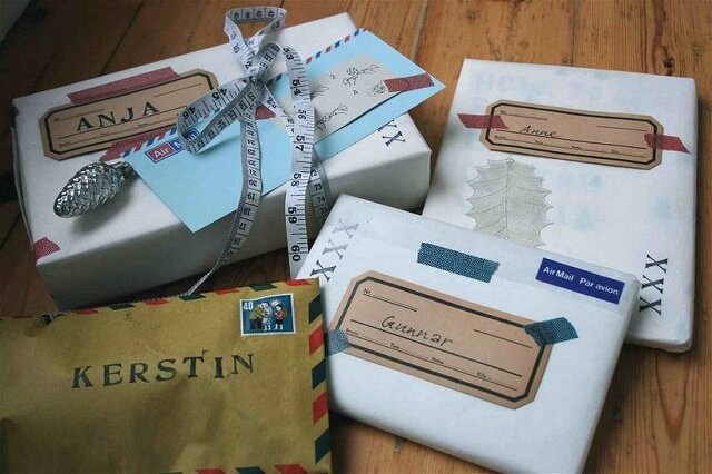 8. Gunakan berbagai barang sisa dari laci kantor Anda: kertas, amplop, label, hingga perangko bekas untuk memberi kesan bahwa kado Anda dikirim dari jauh.