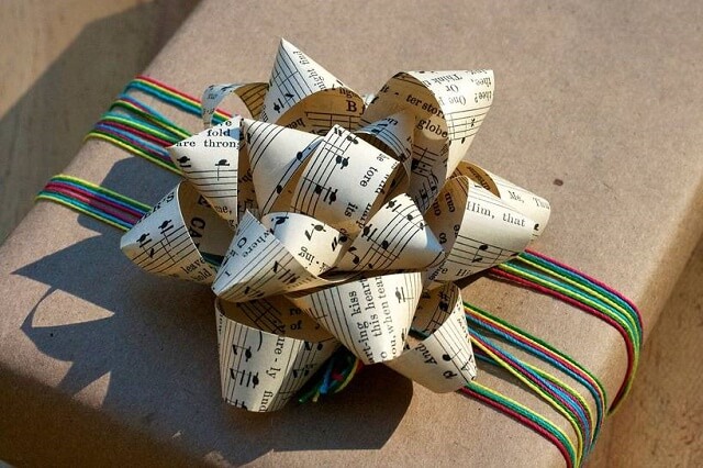 10. Kertas coklat memang menarik untuk dijadikan bungkus kado; kali ini tambahkan benang sisa warna-warni sebagai pengikat dan potongan kertas partitur untuk membuat pitanya.